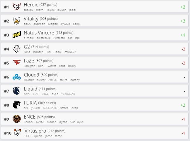 Киберспортивный портал HLTV обновил рейтинг CS:GO-команд. По его итогам Heroic возглавила список коллективов. Вслед за датчанами идет Vitality, далее — NaVi.