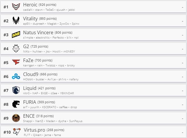 Киберспортивный портал HLTV обновил рейтинг CS:GO-команд. Топ-9 списка остался без изменений — его лидером все так же является состав Heroic. Вслед идут Vitality и NaVi.