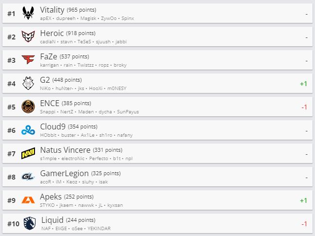 Киберспортивный портал HLTV обновил рейтинг CS:GO-команд. Лидирует в списке Vitality. Heroic находится на второй строчке, FaZe Clan — третий.