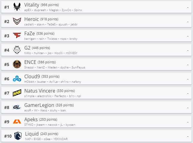 Киберспортивный портал HLTV обновил рейтинг CS:GO-команд. Топ-14 списка остался без изменений — лидирует в нем Vitality. Следом идут Heroic и FaZe Clan.