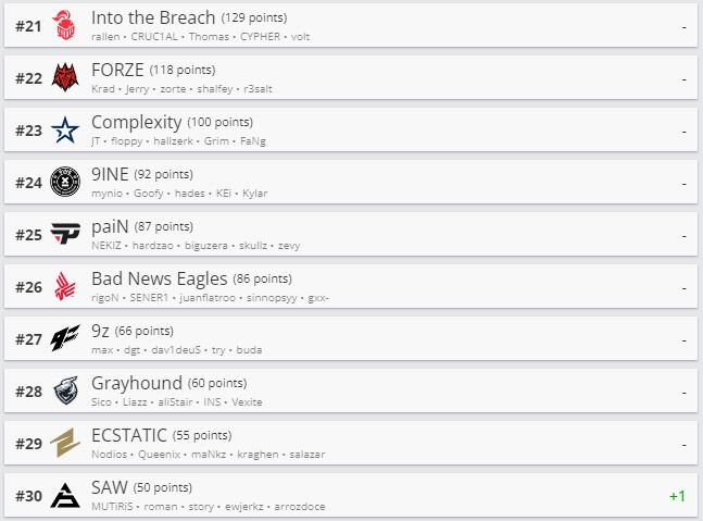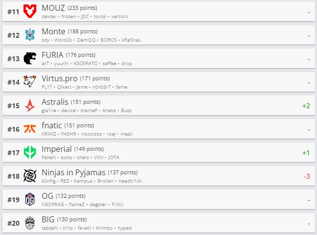 Websterz поднялась в рейтинге на 66-е место. Question Mark (ex-Iron Branch) занимает теперь 72-ю строчку. Белорусская организация Nemiga вернулась в рейтинг на 155-м месте.