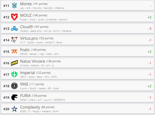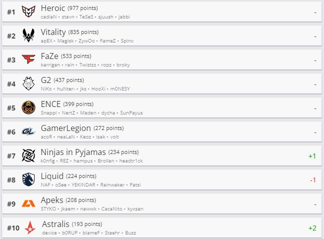 Киберспортивный портал HLTV обновил рейтинг CS:GO-команд. Первую строчку топа все так же занимает Heroic. Следом идут Vitality и FaZe Clan.