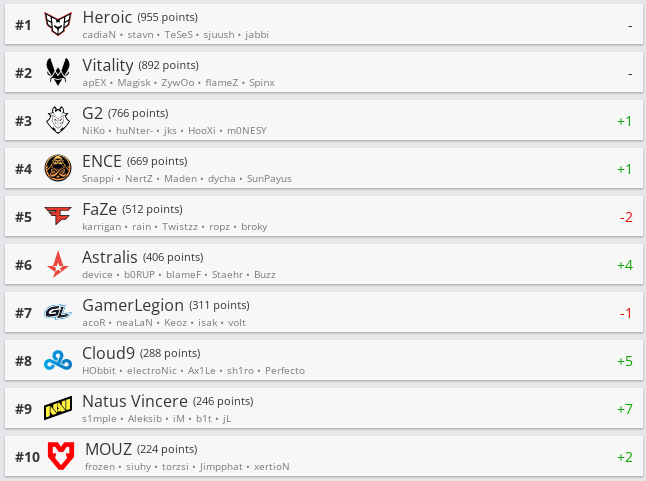 Киберспортивный портал HLTV обновил рейтинг CS:GO-команд. Лидирует в рейтинге все так же Heroic, а следом идет состав Vitality. G2 вернулась в топ-3 списка.