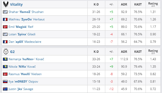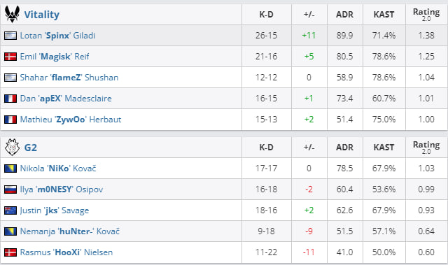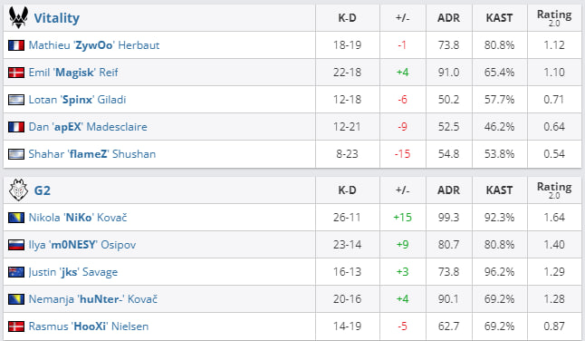 Team Vitality победила G2 Esports в полуфинале Gamers8 2023 по CS:GO. Результат встречи — 2:1 (16:12 на Inferno, 10:16 на Anubis и 19:15 на Mirage). Команда Дана “apEX” Мадесклера вышла в финал турнира, где 20 августа в 20:00 сразится с ENCE в матче до двух побед.