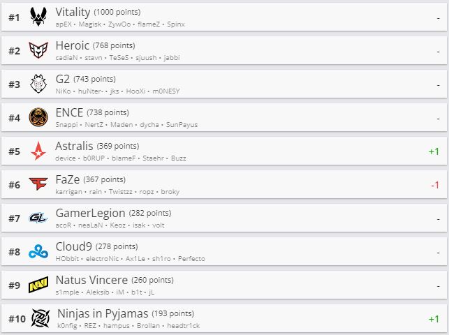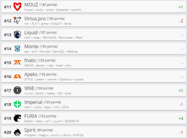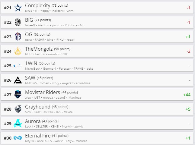 Киберспортивный портал HLTV обновил рейтинг CS:GO-команд. Топ-10 остался без особых изменений. Movistar Riders поднялись на 44 строчки и занимают теперь 27-е место рейтинга.