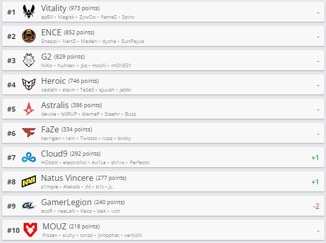 Киберспортивный портал HLTV обновил рейтинг CS:GO-команд. Топ-6 списка остался без изменений. Лидирует в списке все так же Vitality.