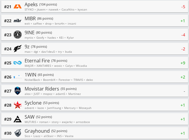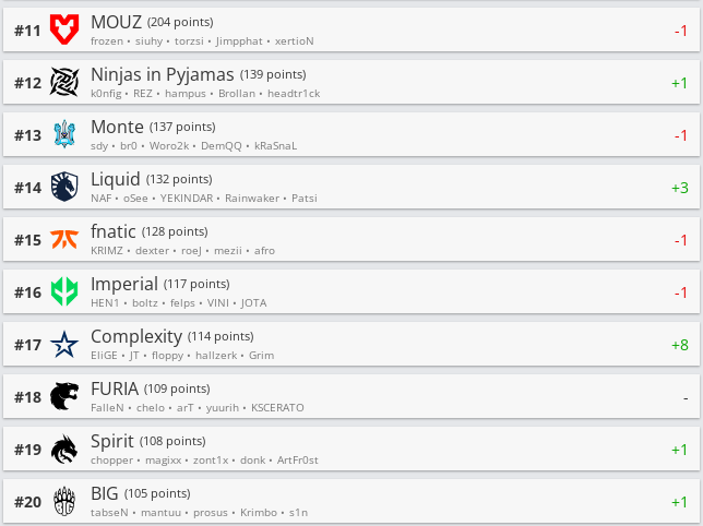 Белорусская организация Betera опустилась в рейтинге на 79-е место. Websterz оказалась на 99-й строчке. Nemiga Gaming после серии замен пропала из рейтинга от HLTV.