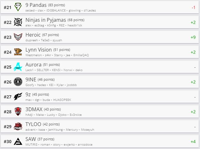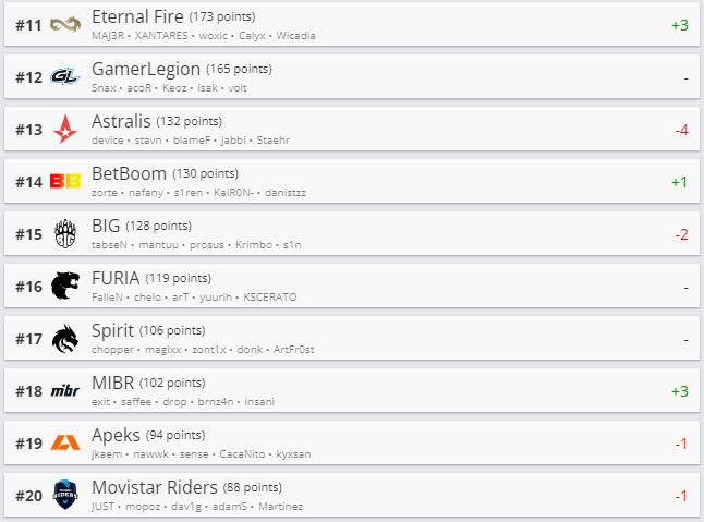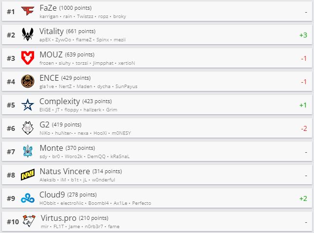 Киберспортивный порта HLTV обновил рейтинг CS-команд. Лидирует в списке по-прежнему FaZe Clan. Следом идут Vitality и MOUZ. Отметим, в топ-10 теперь находится четыре команды из Восточной Европы: Monte, NaVi, Cloud9 и Virtus.pro.