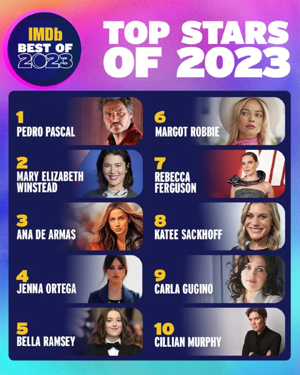 Популярный кинопортал IMDb подвел итоги уходящего 2023 года, опубликовав списки самых популярных артистов, фильмов и сериалов. Рейтинги составлялись на основе подсчета уникальных визитов на соответствующие страницы IMDB.