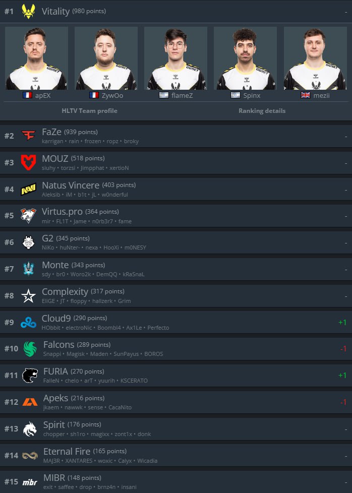 Vitality закрепила за собой лидерство рейтинга команд по CS 2, что, конечно, абсолютно заслуженно. FaZe Clan были близки занять место “пчел”, однако поражение на BLAST Premier: Fall Final 2023 в финале расставило все на свои места, европейскому коллективу придется довольствоваться лишь второй строчкой.