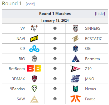 Первые матчи турнира стартуют уже сегодня, 18 января, и начнутся в 18.00. В группе “А” Восточную Европу представят Virtus.pro, NaVi, Cloud9, BetBoom Team и 9Pandas. В “B” сыграют Team Spirit, Amkal, Aurora, IKLA и FORZE. С расписанием первого раунда можно ознакомиться ниже.