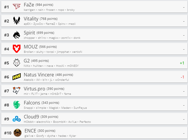 Киберспортивный портал HLTV обновил рейтинг CS-команд. Лидером списка все так же является FaZe Clan. Natus Vincere покинули пятерку сильнейших.