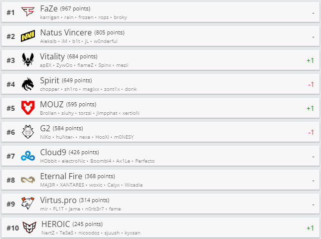 Киберспортивный портал HLTV обновил рейтинг CS-команд. Лидирует в списке по-прежнему FaZe Clan. Следом идут NaVi и Vitality.