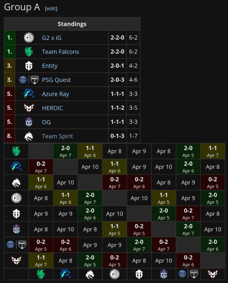 Вчера, 7 апреля, закончился третий игровой день на Elite League по Dota 2. По его итогам было сыграно десять матчей, пять из которых закончились вничью. Team Spirit потерпела третье поражение на турнире и сейчас находится на последнем месте группы “A”. BetBoom Team не смогла повторить успех первой карты против Tundra Esports — матч закончился со счетом 1:1. Команда занимает одно из последних мест после 4 сыгранных матчей.