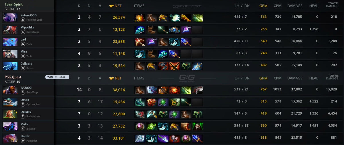 Состав Team Spirit по Dota 2 покинул Elite League. В важном матче группового этапа “драконы” уступили PSG Quest, потеряв шансы на выход в плей-офф — 0:2.
