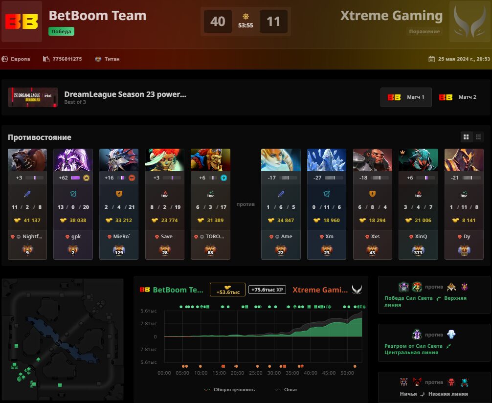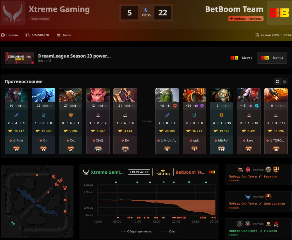 Заключительным матчем дня стала встреча BetBoom Team и Xtreme Gaiming. Несмотря на свою предыдущую победу, китайский коллектив не смог оказать должного сопротивления. BB медленно, но без шансов для оппонента довела первую карту до победного конца. А на второй был тотальный разгром со стороны российской команды. Ростер Ame отправился вслед за соотечественниками, но на шаг выше — четвертое место и $85 000.