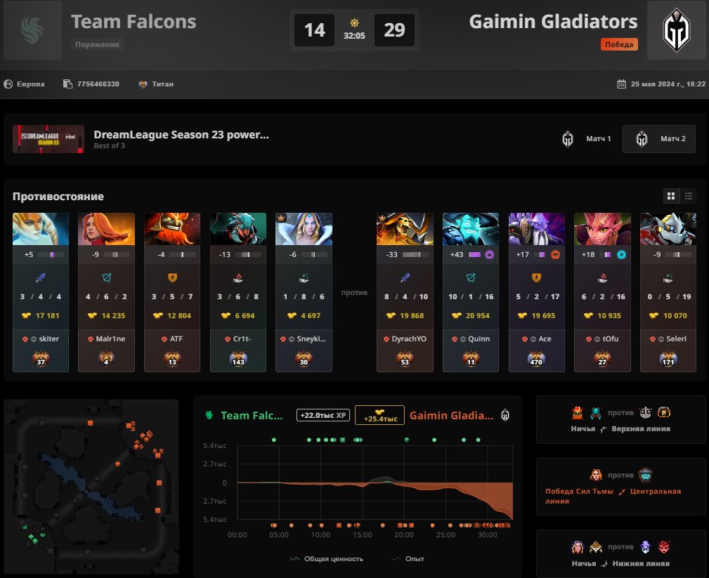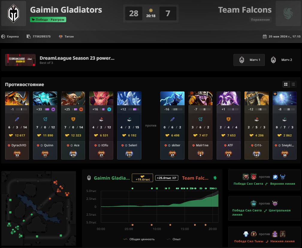 Следующим матчем стал финал верхней сетки между Gaimin Gladiators и Team Falcons. И несмотря на прошлые грандиозные успехи “соколов”, в этом противостоянии они ничего не смогли сделать с коллективом dyrachyo. “Гладиаторы” всухую расправилась с соперником и вышла в гранд-финал.
