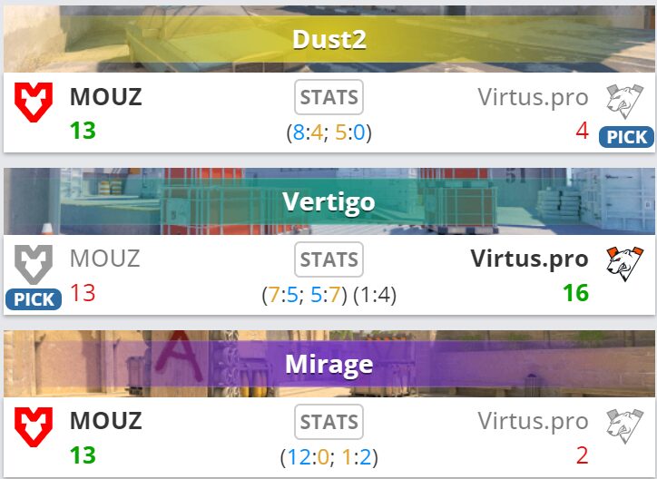 Но “мышки” были готовы к такому сюрпризу и закрыли оппонента 13:4. На второй карте VP смогли сравнять счет, забрав на допах de_vertigo. Ну а на третьей было тотальное избиение со стороны MOUZ, которая закончила первую половину 12:0 и на второй отдала лишь два раунда.