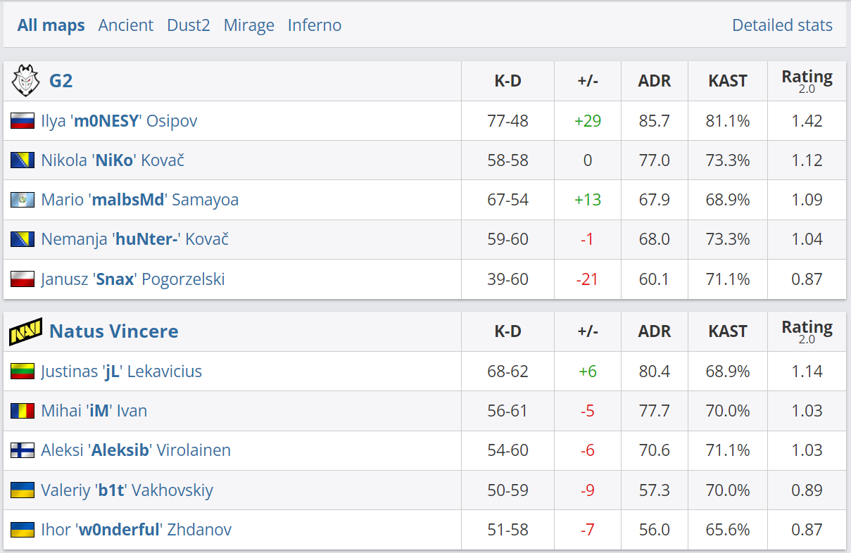 Состав G2 Esports по CS 2 стал чемпионом BLAST Premier Fall Final 2024. В гранд-финале NiKo и компания сенсационно одолели команду NaVi со счетом 3:1. Самым результативным игроком матча стал Илья “m0NESY” Осипов с рейтингом 1.42. В то же время у “черно-желтых” только jL мог похвастаться положительной статистикой.