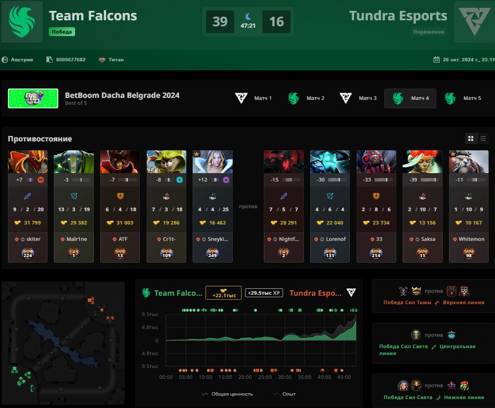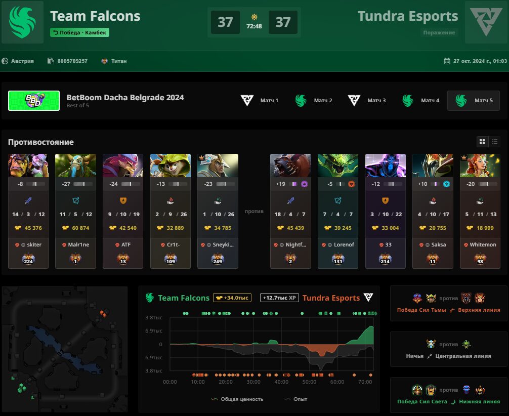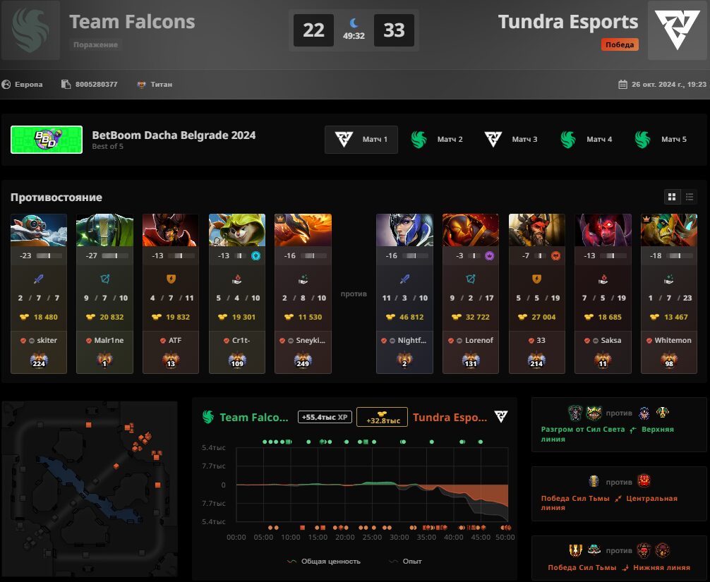 Состав Team Falcons по Dota 2 стал чемпионом BetBoom Dacha Belgrade 2024. В bo5 гранд-финале “соколы” в тяжелейшей борьбе смогли одолеть команду Tundra Esports. Были сыграны все пять карт, из которых решающая пятая и вовсе перевалила за 70 минут.