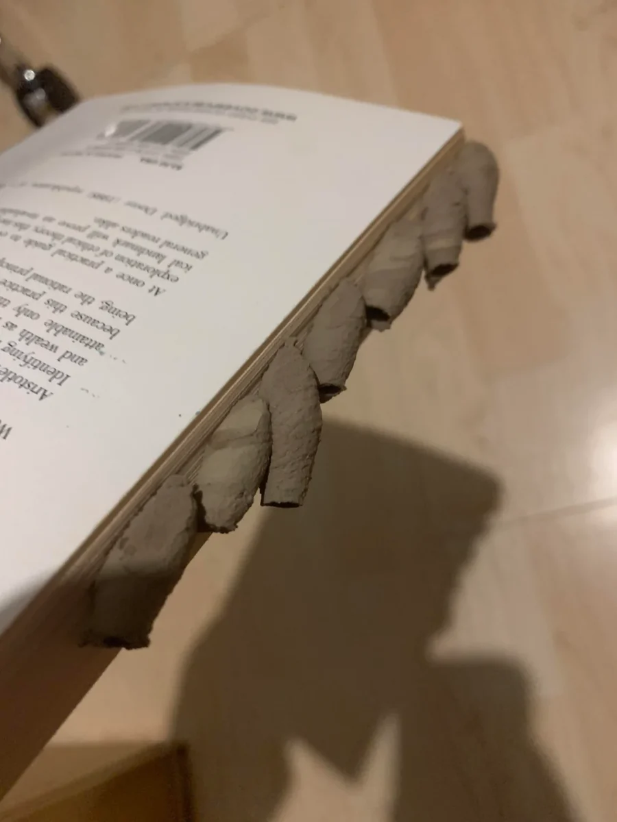 Пользователь Reddit Heskyy поделился фотографиями книги, забытой на полке. Его внимание привлекли странные образования, напоминающие крошечные сморчки. Семь из них прочно зацепились за обрез.