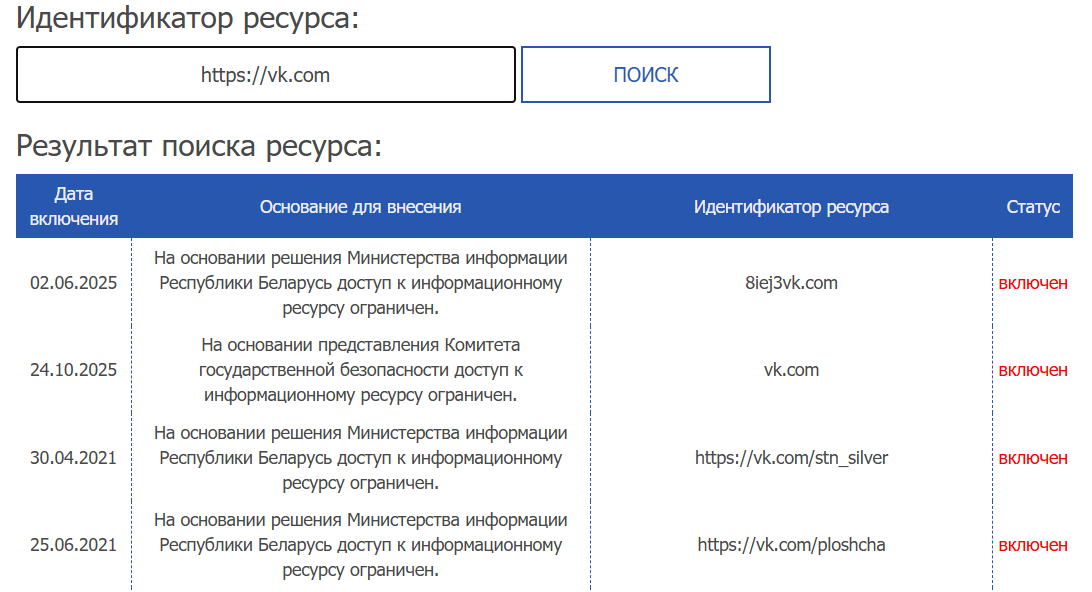 24 октября 2025 года в Беларуси был ограничен доступ к социальной сети «ВКонтакте». Согласно данным государственного предприятия БЕЛГИЭ, решение принято на основании представления Комитета государственной безопасности. Длительность и конкретные причины ограничения не раскрываются.