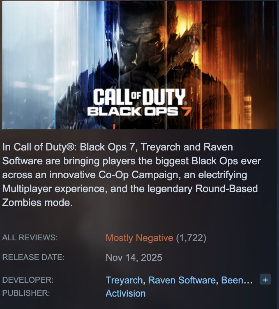 По данным Steam, рейтинг Call of Duty: Black Ops 7 упал до “в основном отрицательного”, и только 39% англоязычных рецензентов дали BO7 положительную оценку. Что касается всех языков, то последняя часть CoD едва цепляется за “смешанный”, но с 40% положительных отзывов он, скорее всего, опустится до “отрицательного”.
