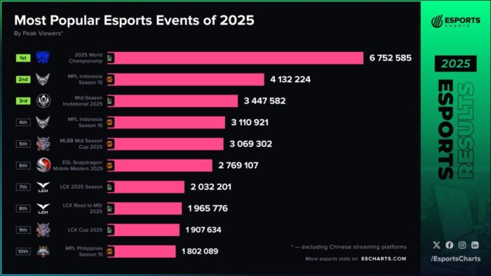 По данным порталаEsports Charts+1, Worlds 2025 — чемпионат мира по League of Legends — возглавил рейтинг самых популярных киберспортивных турниров года по пиковому числу зрителей в прямом эфире. Во время финала между командами T1 и KT Rolster трансляция собрала свыше 6,7 млн одновременных зрителей, что сделало событие лидером среди всех турниров 2025 года по этому показателю.