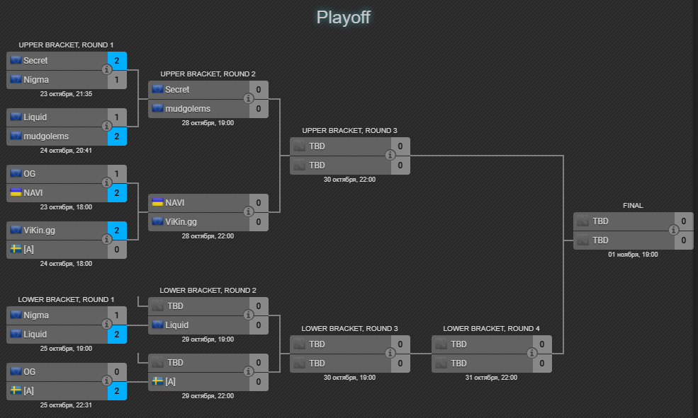 The Alliance обыграл OG в нижней сетке плей-офф на ESL One Germany 2020. Матч закончился со счетом 2:0. Alliance продолжает выступление на соревновании, следующий матч назначен на 29 октября в 22:00. OG выбыли с турнира.