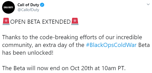 Разработчики Call of Duty: Black Ops Cold War объявили в твиттере, что продляют открытое бета-тестирование. Изначально тест должен был закончится 19 октября, но его увеличили еще на один день: бета-тест завершится 20 октября в 20:00.