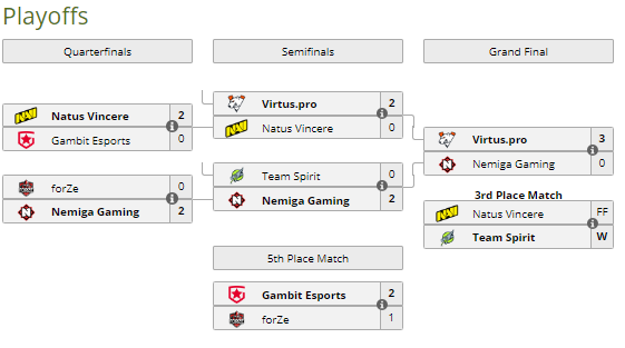 Команда Virtus.pro обыграла Nemiga на третьей карте (Inferno) финала IEM XV – New York: СНГ (16:13) и одержала победу на турнире (3:0). Белорусская команда заработала 7 тысяч $. Чемпионам досталось 20 тысяч.
