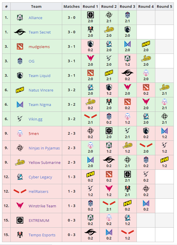 Выступление в нокаут-стадии продолжат Alliance (3 победы : 0 поражений), Team Secret (3:0), OG (3:1), Team Liquid (3:1), mudgolems (3:1), Natus Vincere (3:2), Nigma (3:2) и Vikin.gg (3:2).