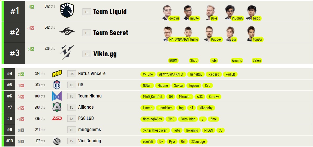 Новый рейтинг ESL среди команд по Dota 2 возглавляют Team Liquid, Team Secret, Vikin.gg.