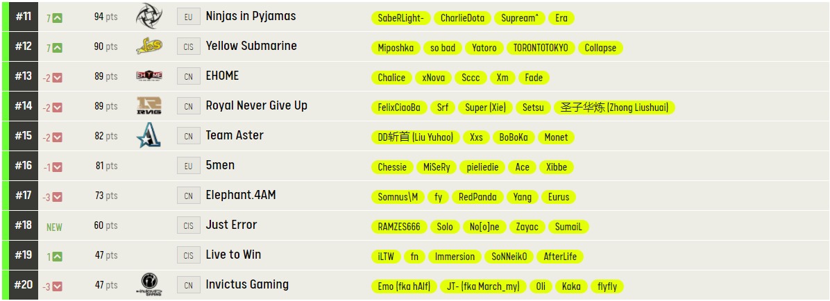 Alliance с нашим соотечественником fng опустился на две позиции и стал седьмым. А вот Yellow Submarine, в составе которой белорус so bad, поднялась на семь позиций и заняла 12 место. Khan сразу с тремя дотерами из Беларуси – young G–chshrct – j4, улучшила свой рейтинг и стала на пять строчек выше.