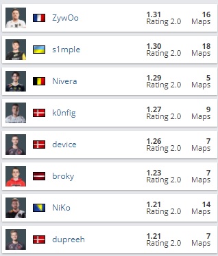 Француз закончил турнир с рейтингом 1.31. В топ-3 также вошли Александр S1mple Костылев (1.30) и шестой игрок Vitality Набиль Nivera Бернлитом (1.29).