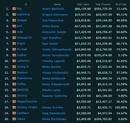 За 2020 год 76 белорусов из разных дисциплин заработали $272,3 тыс. Возглавляет список Артем fng Баршак. У него $66,1 тыс.