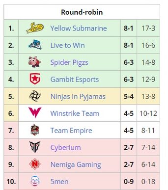 По итогам групповой стадии в первый дивизион вышли четыре команды: Yellow Submarine, за которую играет so bad, Live to Win, Spider Pigzs и Gambit Esports. Еще две команды – Ninjas in Pyjamas и Winstrike Team остались в нижней сетке второго дивизионе. Team Empire, 5men, Cyberium в составе с chshrct и Nemiga Gaming покидают соревнования. Даты проведения основного этапа будут объявлены позднее.