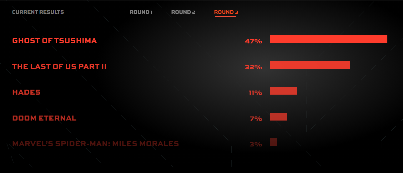 Второе место заняла The Last of Us Part II — 32%. В течение последних дней голосования два эксклюзива PlayStation шли вровень, некоторое время тайтл Naughty Dog даже опережал соперника. На третьей строчке разместилась Hades с 11% голосов. Замкнули пятёрку лидеров Doom Eternal и Marvel’s Spider-Man — 7% и 3% соответственно.