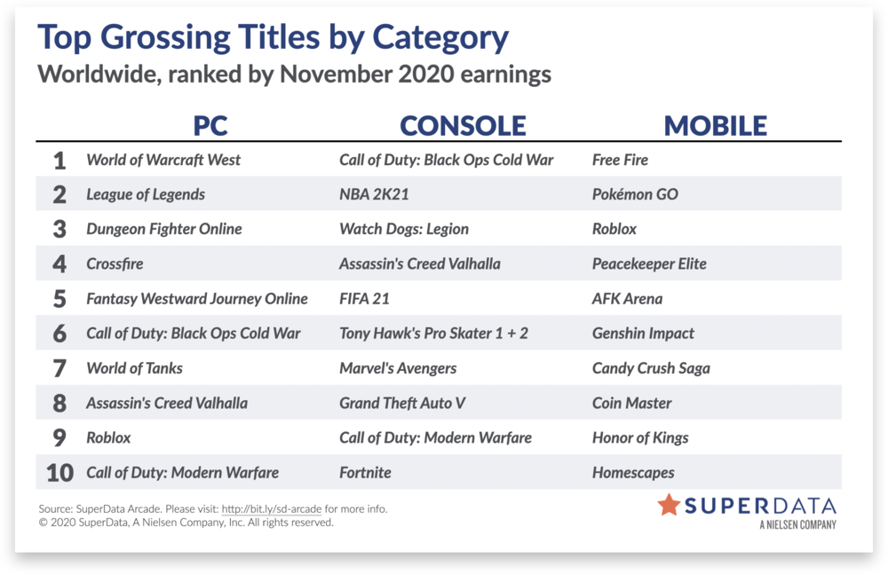 Самой прибыльной игрой на ПК стала World of Warcraft, на консолях Call of Duty: Black Ops Cold War, а на мобильных устройствах Free Fire.