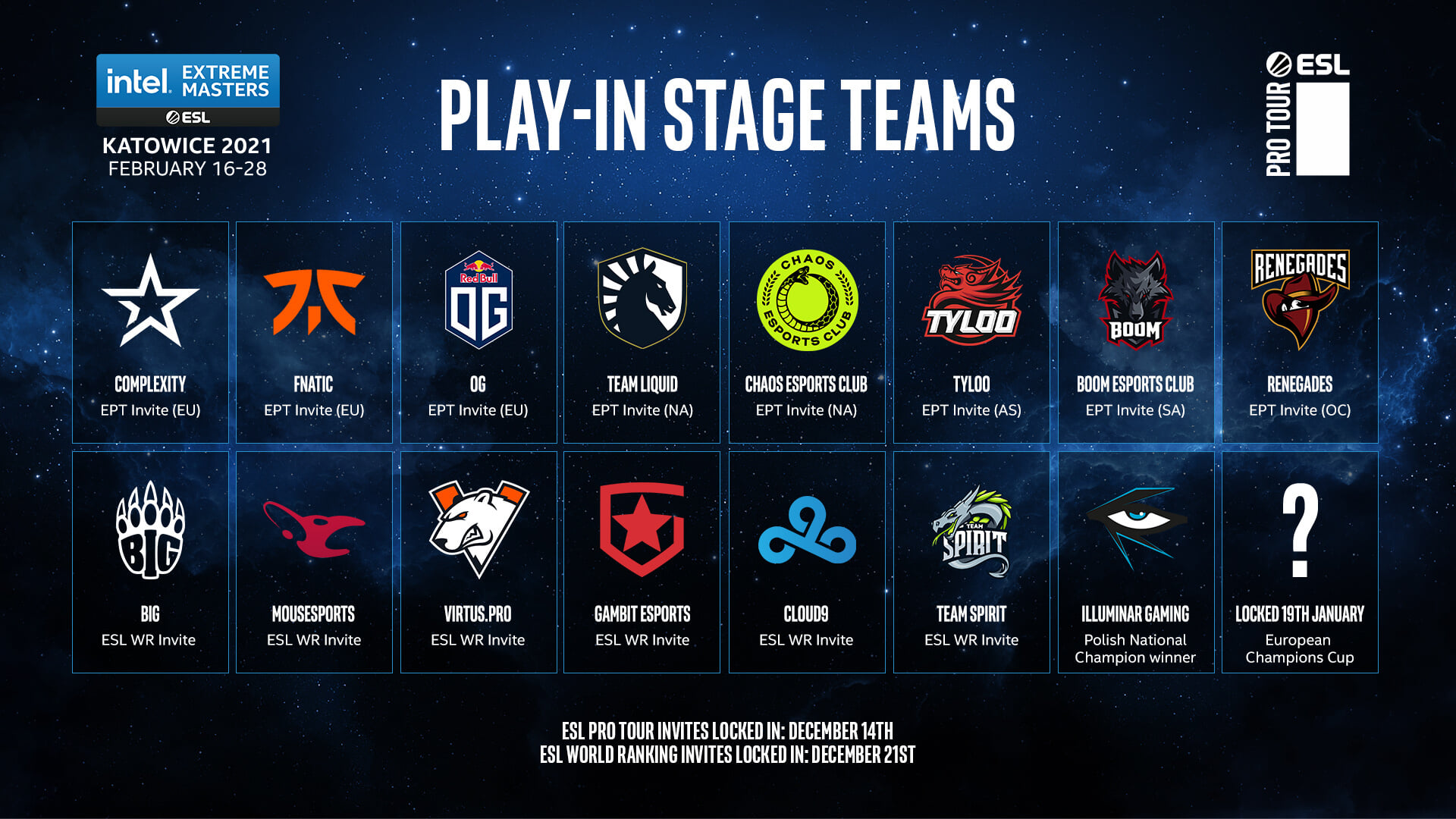 В стадии плей-ин примут участие 16 команд, из которых половина пройдет в групповую стадию. Последний слот достанется победителю European Championship Winter 2020 (финал состоится 19 января).