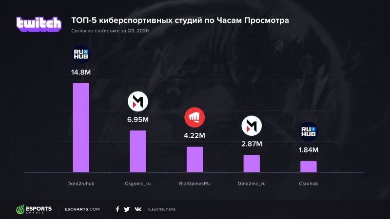 По данным аналитического агентства в сфере киберспорта Esports Charts в третьем квартале 2020 года в СНГ трансляции по Dota 2 больше смотрели на канале студии RuHub, а вот по просмотрам CS:GO первенство у Maincast.