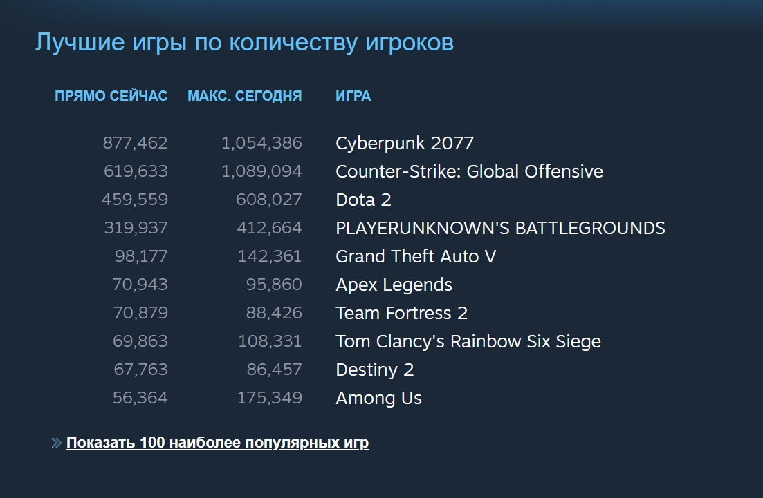 Конечно же, главная звезда — Cyberpunk 2077. Она поставила абсолютный рекорд по количеству играющих для сюжетных игр в 1.05 миллиона игроков. Также сыграла на руку и пандемия, заставляющая людей реже выходить на улицу.