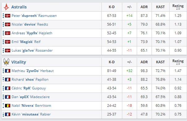 Astralis выиграла Vitality со счетом 2:1 и стала первым финалистом турнира BLAST Premier: Global Final 2020. Vitality опустилась в нижнюю сетку, где с победителем пары Liquid — NaVI разыграет вторую путевку в гранд-финале соревнований.