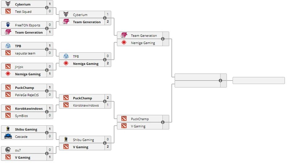 Завтра матчи продолжатся. Nemiga Gaming сыграет с Team Generation, а PuckChamp с V Gaming. Начало обоих матчей в 17.00. Сейчас сетка турнира такая: