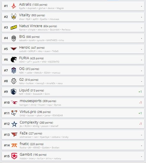 Топ-5 рейтинга также осталась неизменной. Возглавляет таблицу по-прежнему Astralis, следом идут Vitality и NAVI. Heroic на четвертом месте. Замыкает пятерку лучших BIG.