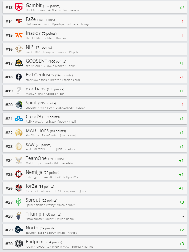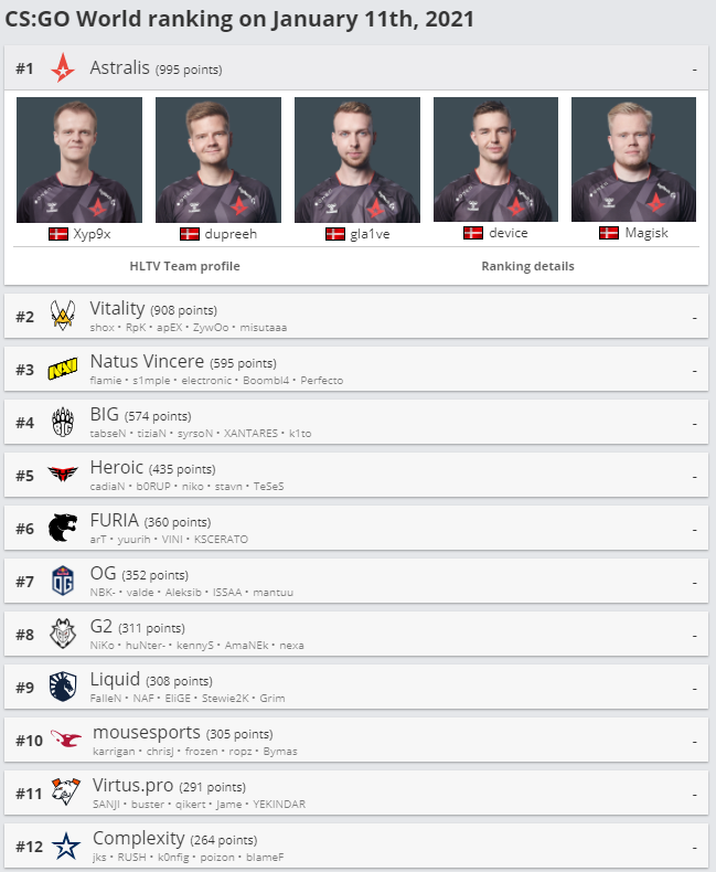 Сайт HLTV.org обновил рейтинг профессиональных команд по CS:GO. В таблице от 11 января белорусская команда Nemiga поднялась на одну строчку и теперь занимает 25 место. Возглавляет рейтинг по-прежнему датский коллектив Astralis. NaVi, которые находятся на третьей позиции, все еще являются самой успешной СНГ-командой.