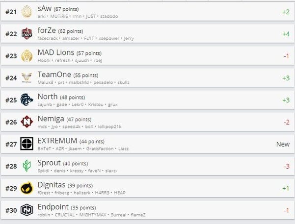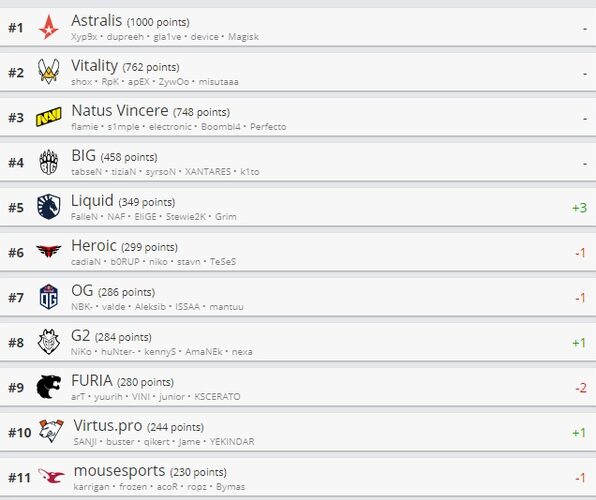 В рейтинге осталась без изменений тройка лидеров: Astralis, Vitality и Natus Vincere. Четвертое место сохранил за собой коллектив BIG. А вот пятое место досталось Team Liquid, которая поднялась на три позиции.