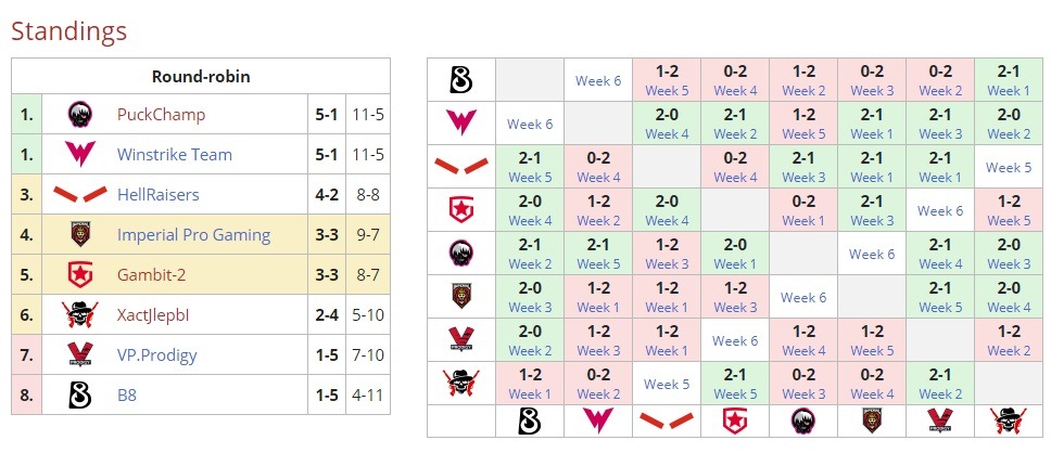 HR, в шести поединках добившись четырех побед, занимает третье место. В активе XactJlepbl две виктории после шести баталий. Этот состав располагается на шестой позиции.