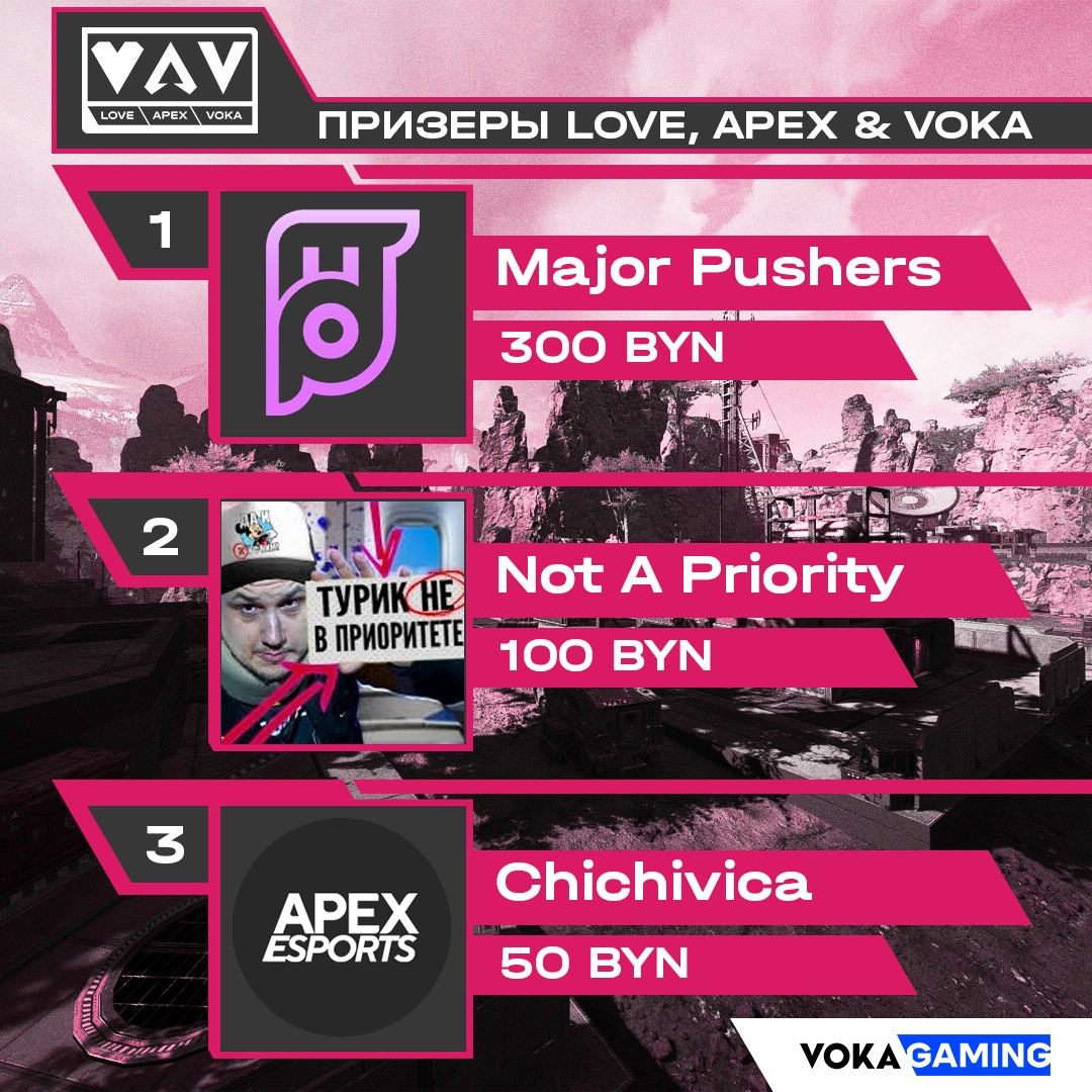 LOVE, APEX & VOKA проходил с 13 по 14 февраля белорусской организацией VOKA Gaming. Призовой фонд соревнования – 500 BYN