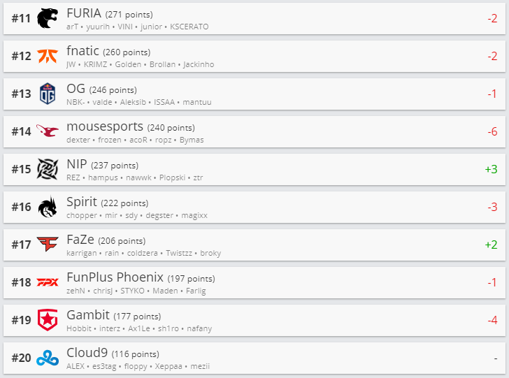 Белорусская команда Nemiga Gaming прибавила 3 позиции и расположилась на 27-ой строчке. Первое место заняли NaVi, а пятое — Virtus.pro.
